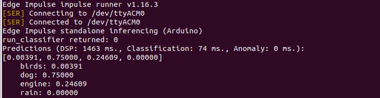 The classification prediction should produce the same prediction results as those in the edge impulse studio test dataset from which you copied the raw features. You may view the results in the Arduino serial port monitor on in your Linux terminal by running “edge-impulse-run-impulse —raw” command which just opens the serial port the device is connected to.