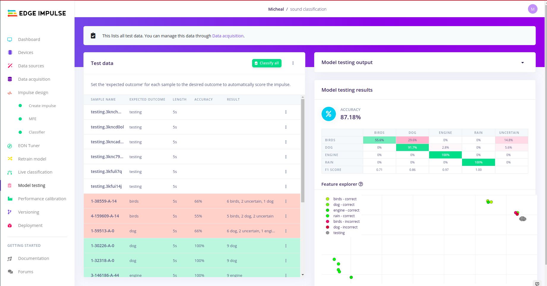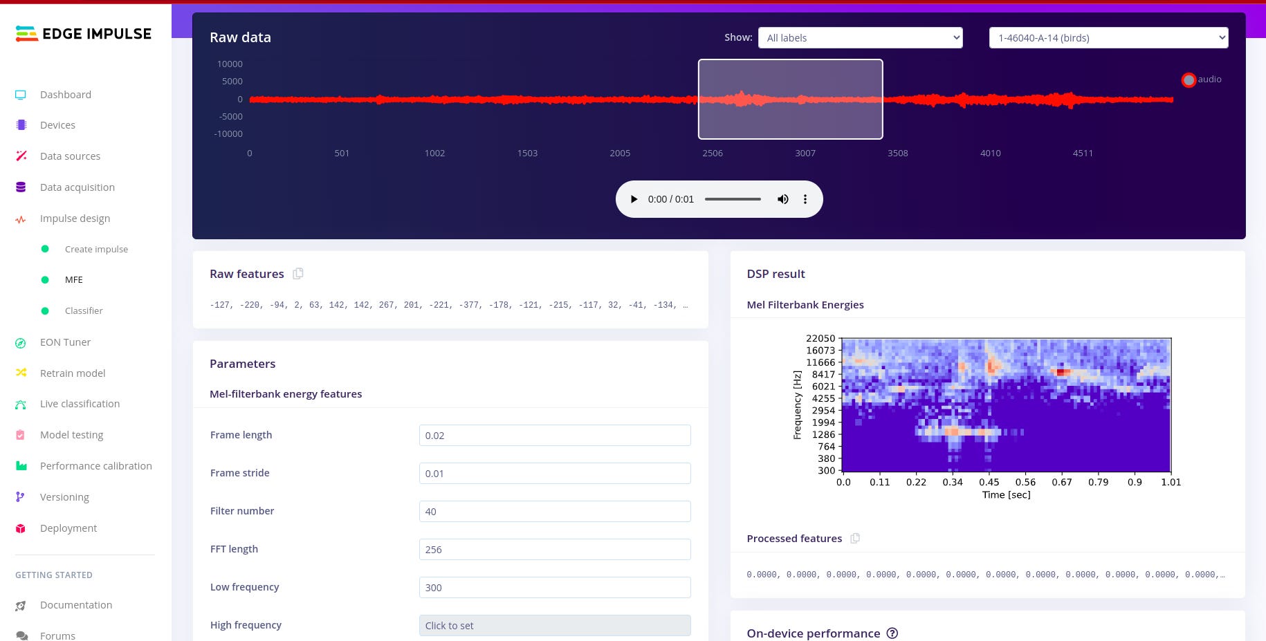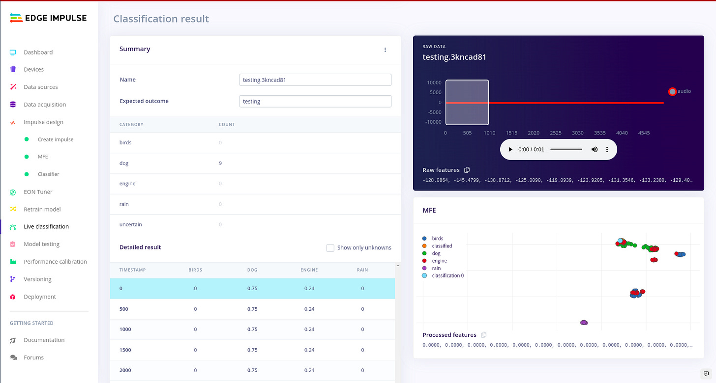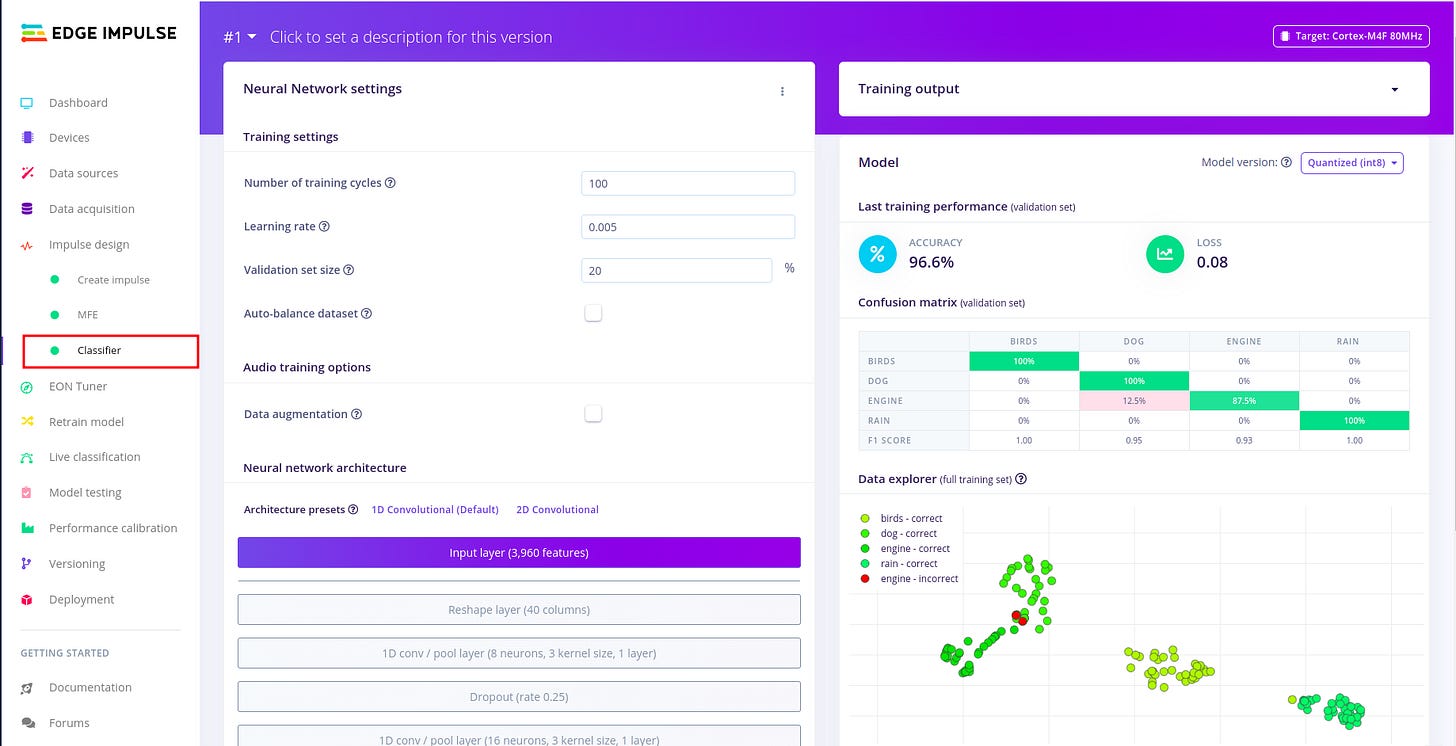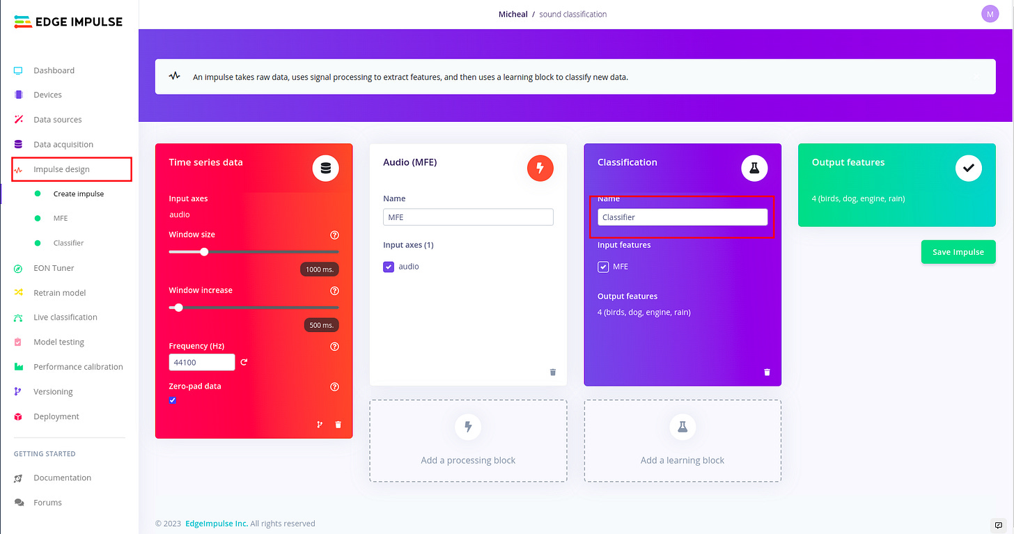 For designing the impulse and configuring the MFE block, I followed the following article written by edge impulse. I found i needed a much deeper understanding about sound, audio and signal processing, so I used the following articles. Audio Deep Learning Made Simple: Sound Classification, Step-by-Step and Machine Learning for Audio Classification. These articles help me to gain more understanding on concepts such as Mel-Frequency Cepstral Coefficients (MFCC). There are other concepts like window size which are well explained in the article above.