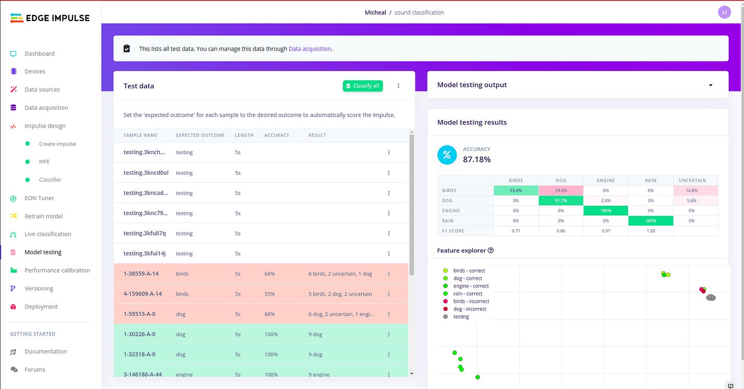 This was of a particular interest, i wanted to test the classified model against using raw data from my board. So to do this, you click under the Live classification tab in edge impulse studio. In order to understand more of what is going on with model testing kindly refer to the article above. There is no need of repeating it.