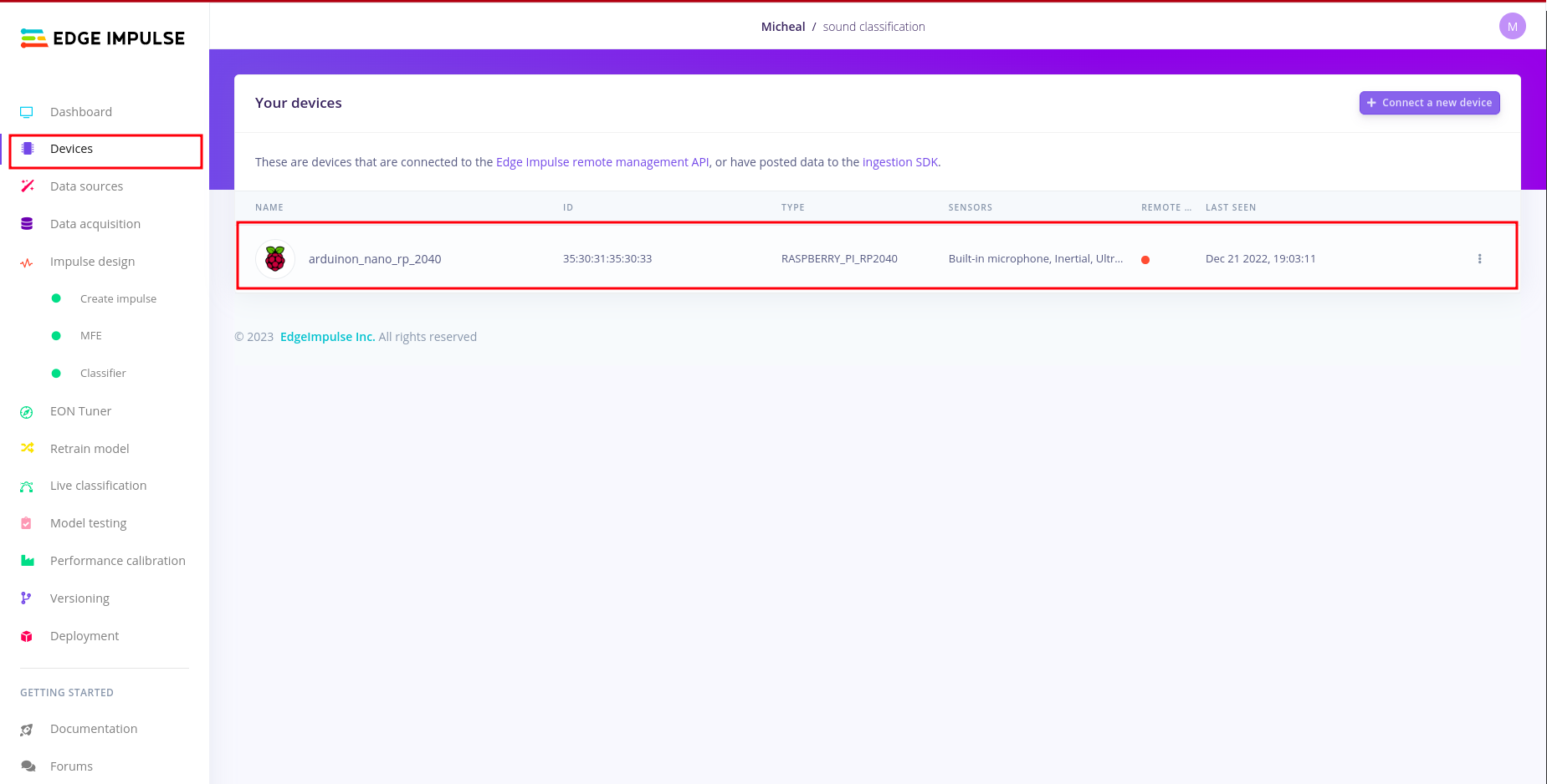 Connect your board to Edge impulse studio: