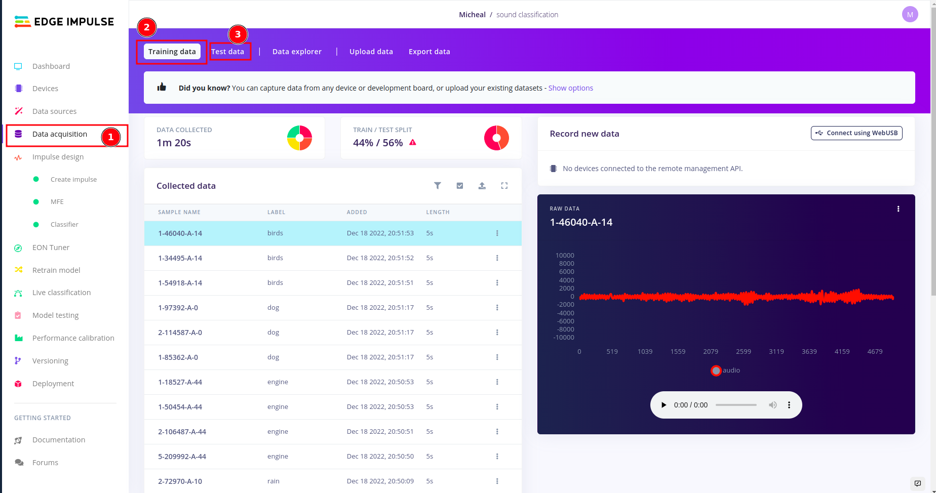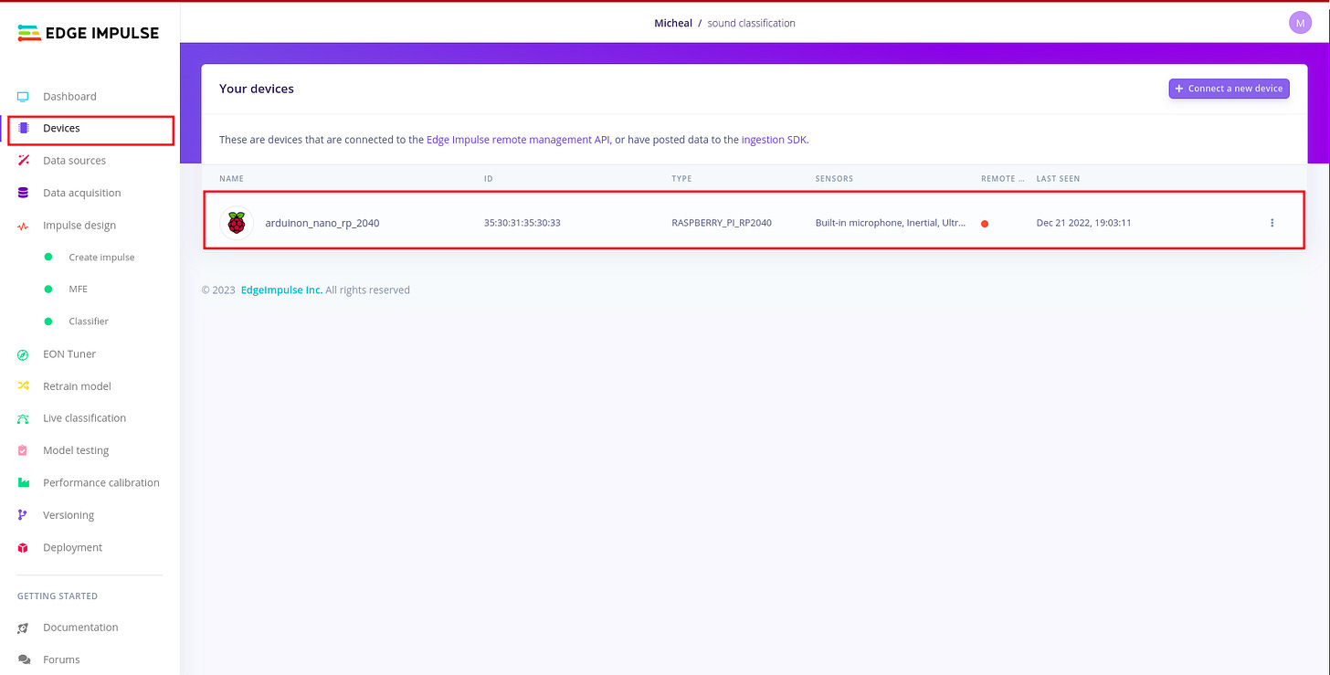 In order to connect your board to edge impulse studio,please follow this article. In edge impulse under devices you should be able to see your device. This is important during the Live classification because you want to listen to raw audio signals from the environment.