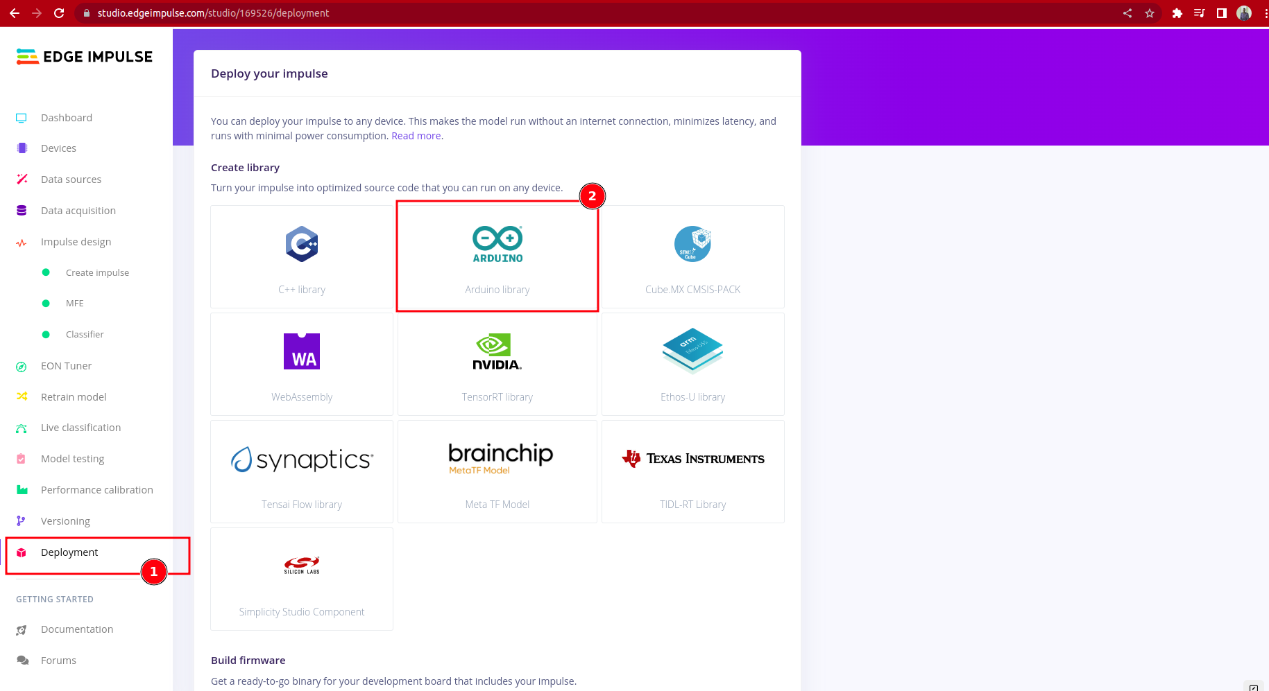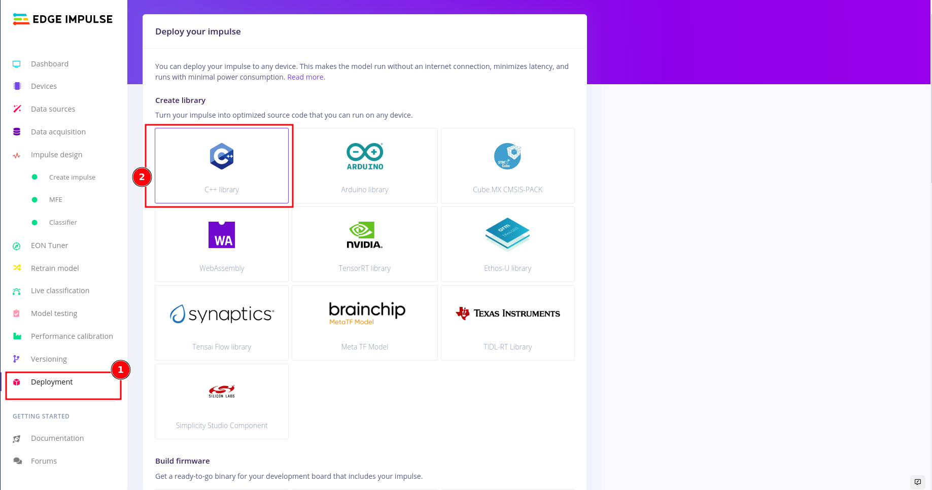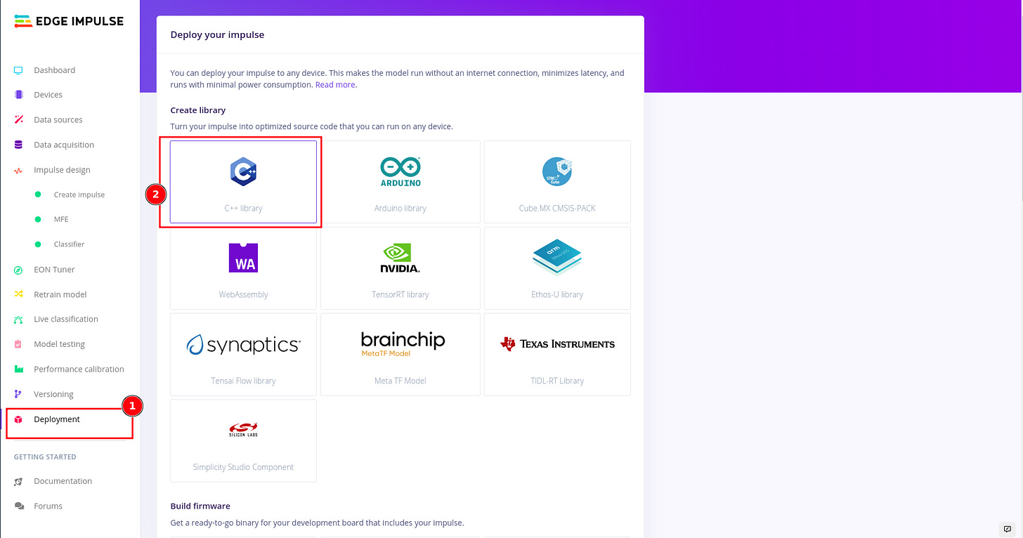 In-order to deploy your model to any target device that can compile C++, first select the C++ Library under deployment tab in your edge studio.