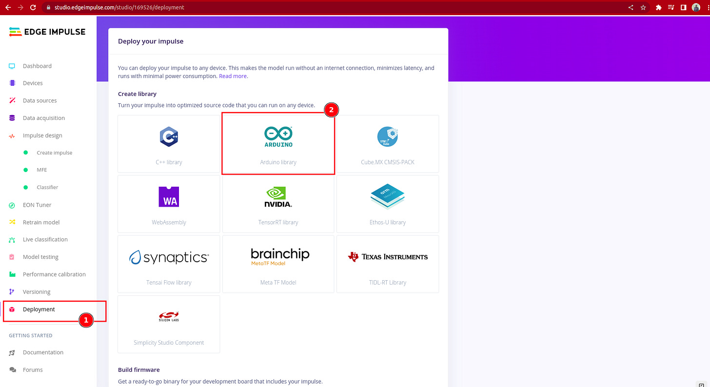 There are many targets in which we can deploy our model but for this example we shall cover deploying to the Arduino Library using the static_buffer sketch and also for any other target that can compiler C++ for example raspberry pi family. There are some important things that need to be noted here that i was particularly unaware of but was made aware by on of the engineers(Louis) at edge impulse.