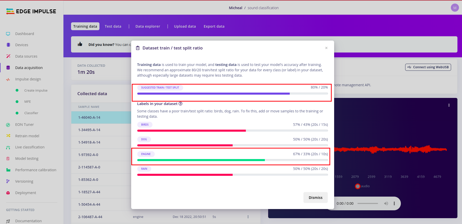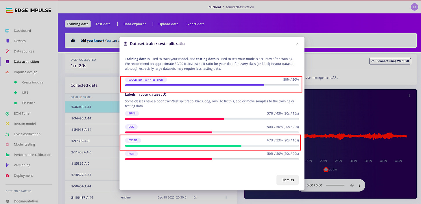 My dataset in this example is poorly split. But it is recommended that you have balanced dataset. To do this kindly click the alert red triangle icon.And you should be able to have a modal window pop up detailing how split your datasets are.