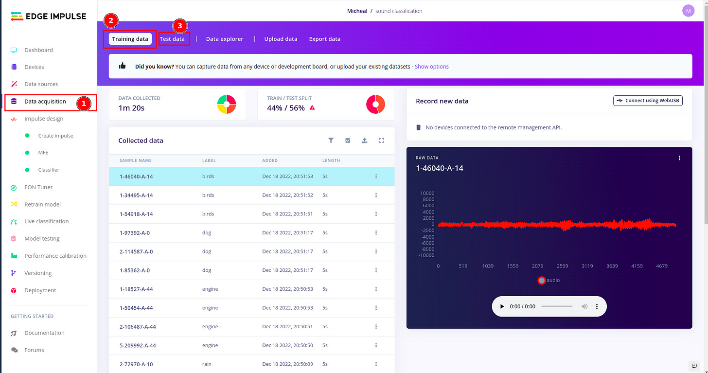 In edge impulse under data acquisition,you can upload both training and test datasets the recommended ratio is 80/20 respectively for every class (or label) in your dataset.